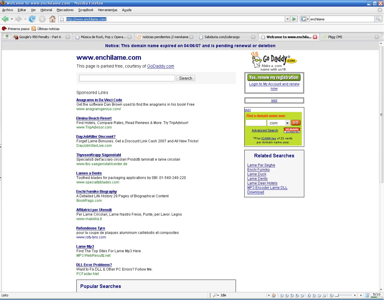 Nos parece muy curioso que se hallan olvidado de renovar el dominio www.enchilame.com la cual es una red social similar a Menéame. Actualmente aparece con publicidad de Godaddy indicando que el dominio se encuentra vencido.